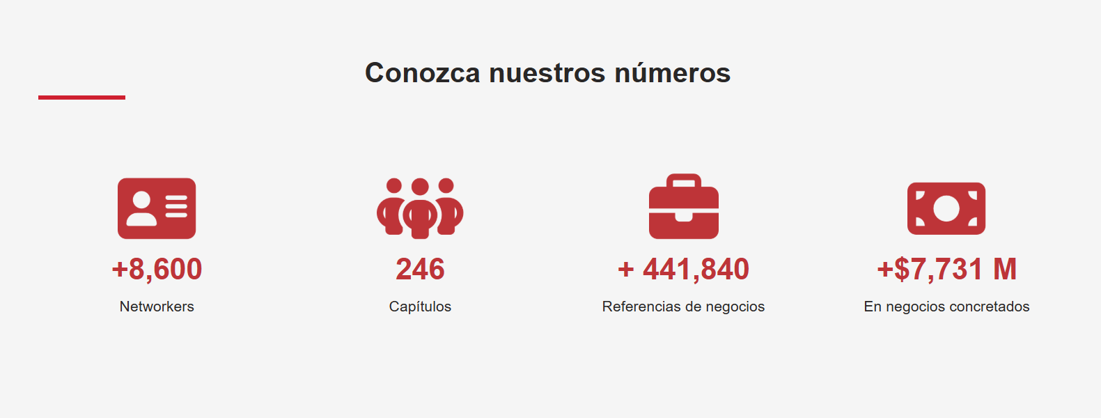 Actualmente, hay más de ______________ Grupos y más de ______________ Miembros en todo el mundo. En los últimos 12 meses, los Miembros de BNI han pasado más de ______________ referidos y eso se traduce en más de ______________ en negocios que se pasaron entre los Miembros.